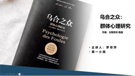 第一组代表罗翠萍同学分享书目是法国著名社会学家、心理学家勒庞的《乌合之众:大众心理研究》,她介绍了群体领袖根据群众的特点对其的掌控的三种方式,并剖析了群体自身形成的各种特点和成因,详细讲述了社会服从和过度服从、群体的反叛、大众文化、受别人支配的自我、群体运动、人的自我异化,官僚化过程以及无意识在社会行为中的作用。她认为,这本书有助于我们更好地从社会学、心理学的角度更好的理解历史和社会运动,以及客观的去评价当今的社会时事热点和事件。此外,她还分享了这本书的观点与自身所学专业社会工作的联系。随后,蔡令军、舒俊杰、李鹏超、张建宇、李紫琳、王旭、陈鹏、曾麟喻等成员也先后分享了其他书籍,用生动的语言讲述书中内容,激发与会者的阅读兴趣。