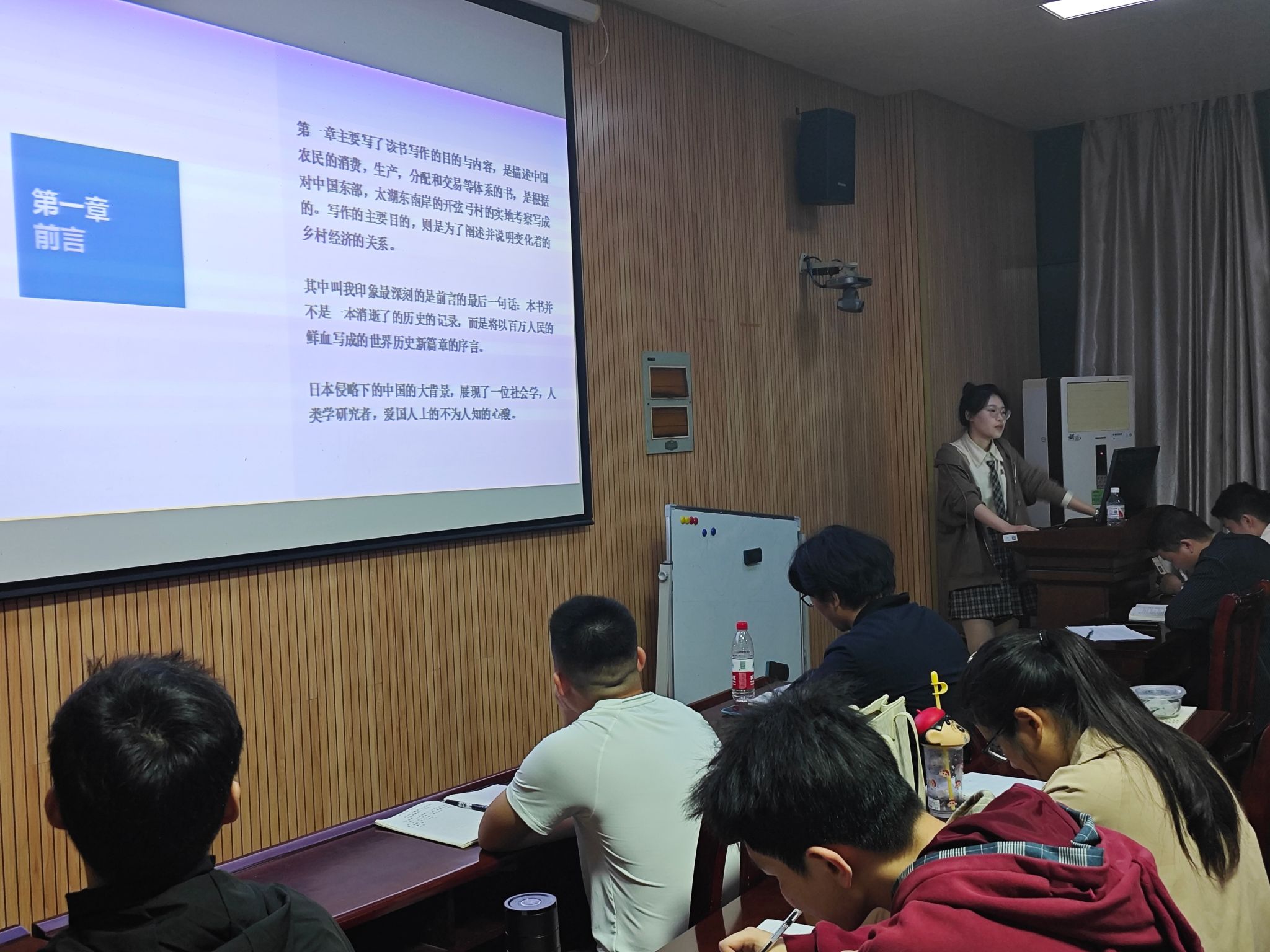 第三位分享者何佳倩同学分享的是费孝通所著的《江村经济》,她为同学们分享了全书各个章节的主要内容,并为大家分享了她印象最深刻的一句话:“本书并不是一本消逝了的历史的记录,而是将以百万人民的鲜血写成的世界历史新篇章的序言。”日本侵略下的中国的大背景,展现了一位社会学,人类学研究者,爱国人士的不为人知的心酸,为同学们展示了学者的家国情怀。