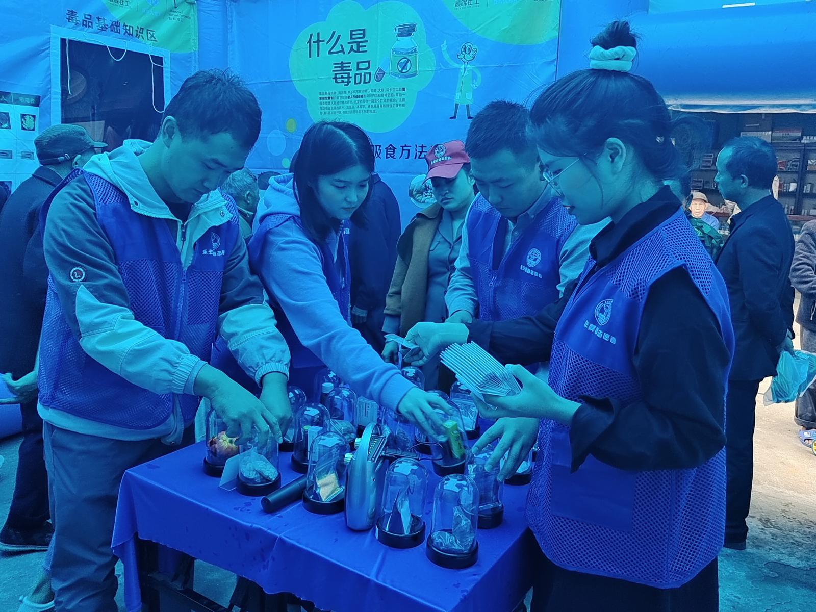 21社研的禁毒志愿者两名是入党积极分子,两名已经提交了入党申请书,他们希望在做实事的道路上提升自己,积极向党组织靠近。活动中他们走进圩镇上,派发禁毒宣传资料,禁毒宣传品等向群众特别是青少年介绍禁毒知识和禁毒重要意义,引导群众在思想上,心理上,行为上提升防毒拒毒的意识和能力,进而鼓励他们进入“禁毒大篷车”,进一步直观了解毒品基础知识、毒品的危害、如何防范毒品等。志愿者通过带领群众参观仿真毒品,涉毒体验区和拒毒防毒区,讲解如何防范和辨识毒品,不少居民表示禁毒宣传非常有意义,能了解很多禁毒知识,听完讲解后有了对毒品防范的进一步认识。